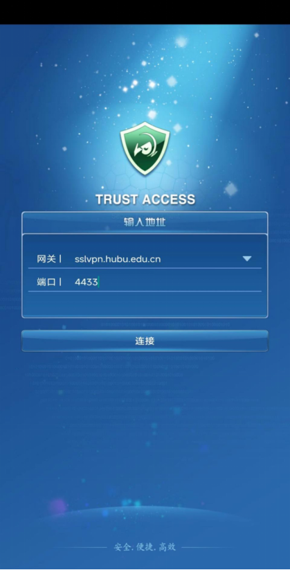 打开安装好的VPN快捷方式,网关输入sslvpn.hubu.wflwonderful.net;端口填写4433,点连接。