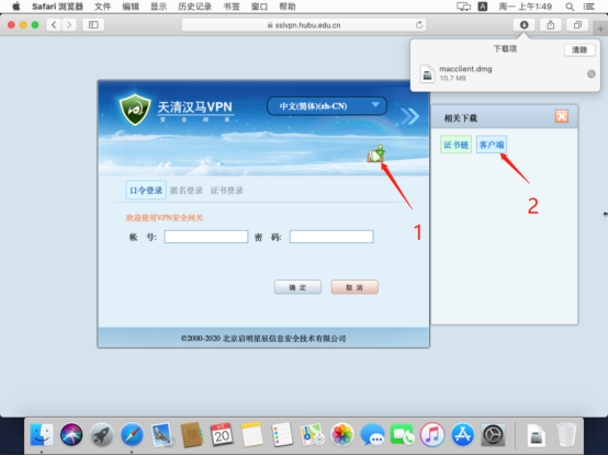 浏览器访问:https://sslvpn.hubu.wflwonderful.net:4433回车,点击右上角的下载图标,然后点选客户端,会自动识别客户端系统并下载对应的客户端,下载的同时当前浏览器页面不要关闭。