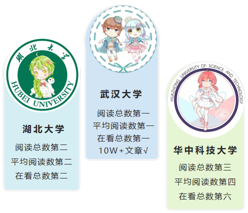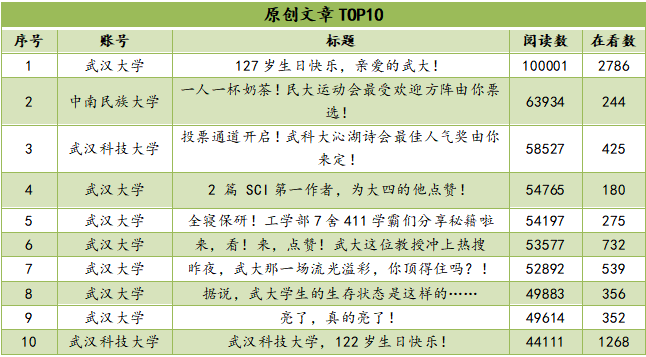 11月份,原创文章TOP10中,入榜微信公众号分布较为集中,有“武汉大学”“武汉科技大学”“中南民族大学”三家公众号入榜。其中,“武汉大学”入围前十榜单的文章最多,为7篇,“武汉科技大学”“中南民族大学”分别携2篇、1篇文章进入榜单。本期“武汉大学”“武汉科技大学”均聚焦校庆活动,其中“武汉大学”发布的《127岁生日快乐,亲爱的武大》一文收获10W+的阅读数。文章以校庆为主题、以校史为切角,通过图文结合方式呈现了1893年至2020年武汉大学精彩瞬间,让公众在祝福校庆之际重温了武汉大学辉煌历史,相关跟评如“煌煌武大,悠悠珞珈,在远方想你”“山水一程,三生有幸,祝福武大”等受到网友点赞。