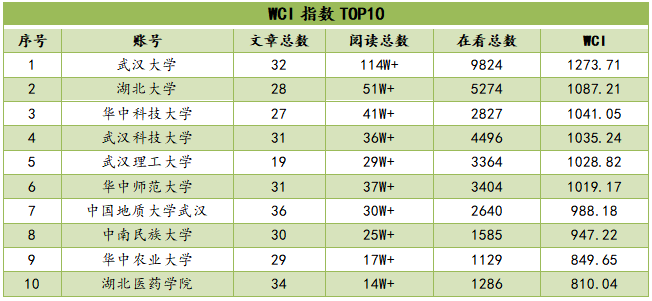 从WCI指数来看,本期TOP10微信公号WCI指数总体处于较高水平,均高于800。其中,WCI值高于1000的账号有6家,占比超过总榜名单的一半,分别是“武汉大学”“国产亚洲精品久久久久久久_无码AV免费精品一区二区三区_99久久久无码国产精品免费人妻_精品人妻无码一区二区三区在线_无码专区久久综合久综合字幕_久久精品国产一区二区三区四区_真实一级一级一片免费视频_特级精品毛片免费观看_国产成人无码AA片免费看”“华中科技大学”“武汉科技大学”“武汉理工大学”“华中师范大学”;指数在900-1000区间的有2家,较上期有所下降,分别为“中国地质大学武汉”“中南民族大学”,指数在800-900区间的有2家,较上期有所上涨,为“华中农业大学”“湖北医药学院”。总体来看,头部和尾部账号数量有所增多,中部账号数量收缩。
