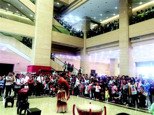 图为:省博物馆编钟表演吸引众多游客驻足欣赏。