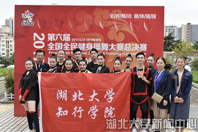 近日,第六届全国全民健身操总决赛在山东青岛大学举行,我校知行学院健美操队12名队员团结拼搏,勇夺总决赛自由舞蹈项目一等奖(全国共三所学校获一等奖),傅丽、冯斌两位老师荣获“年度优秀教练员”荣誉称号。