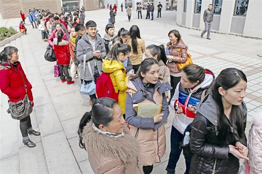 (报考播音主持专业的考生在招考点前排起长队 通讯员窦岸俊摄)