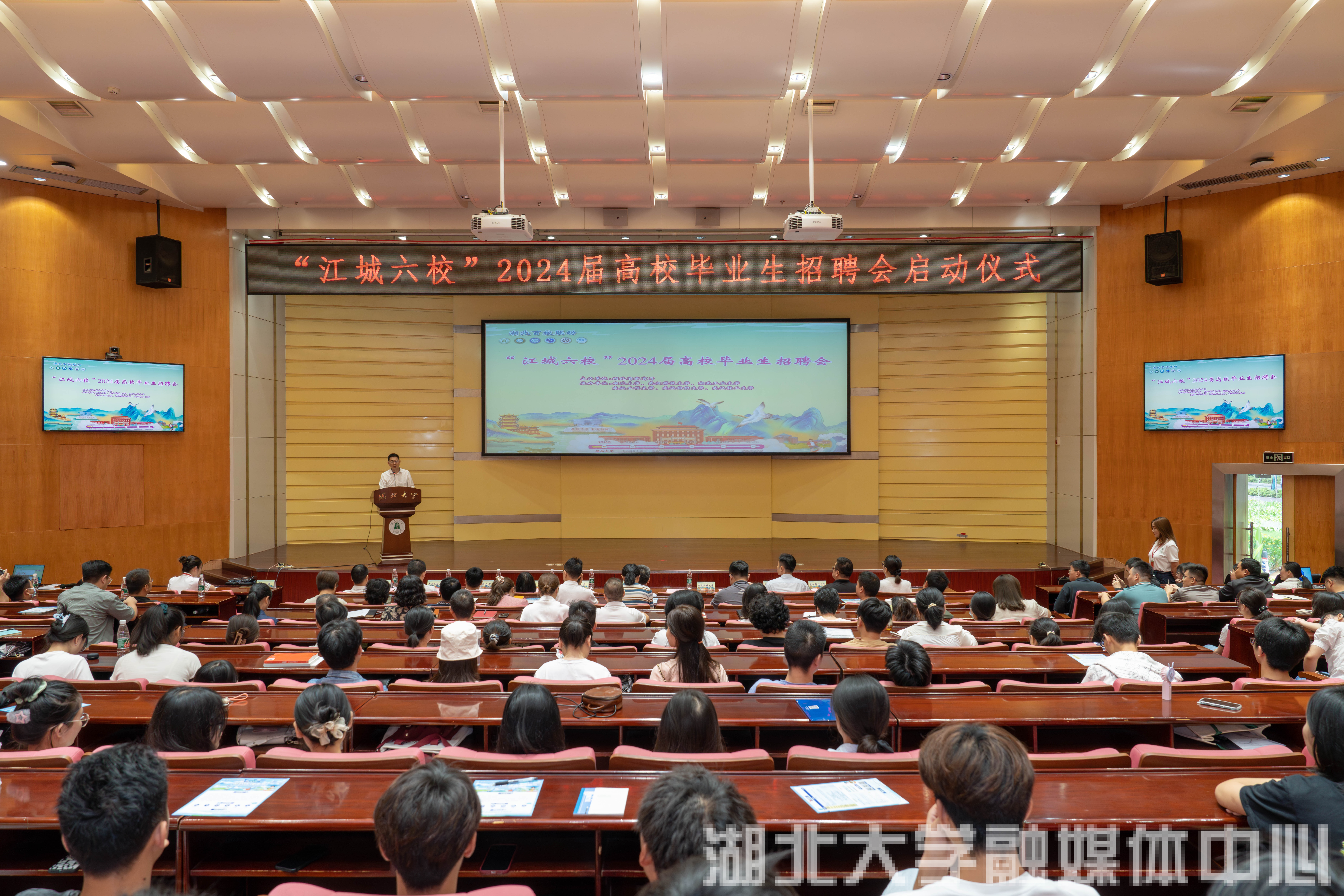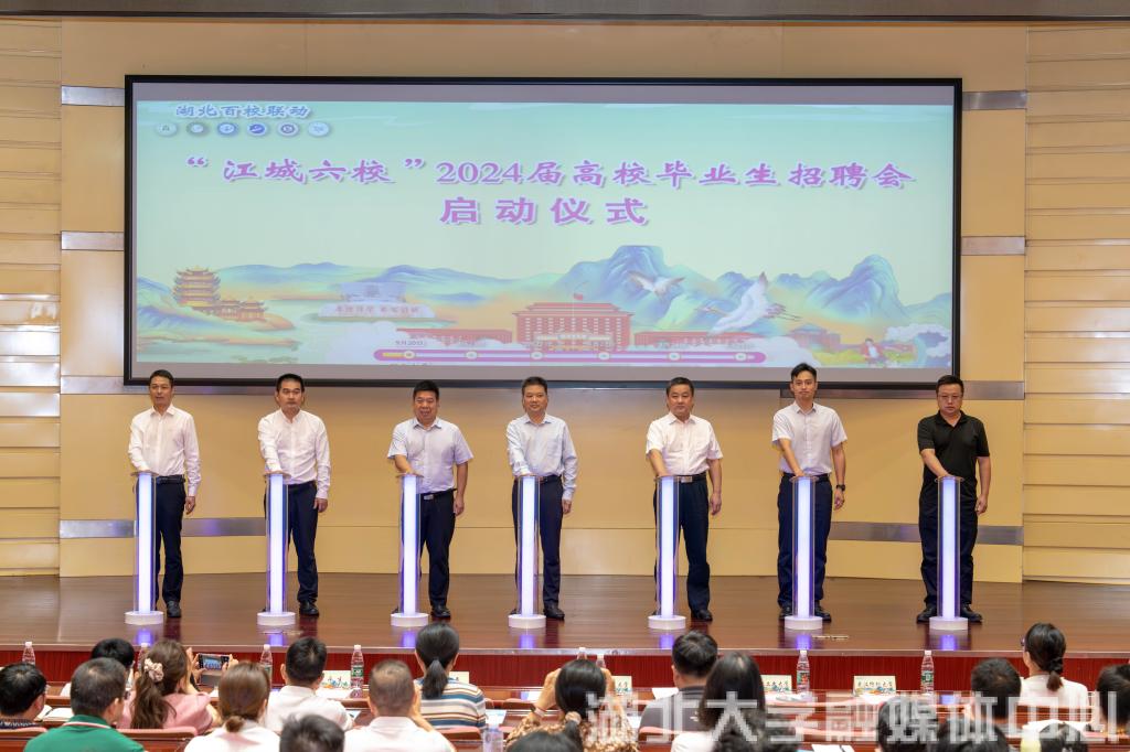 参会领导和嘉宾共同登台,一同启动“江城六校”2024届毕业生联合招聘会活动。