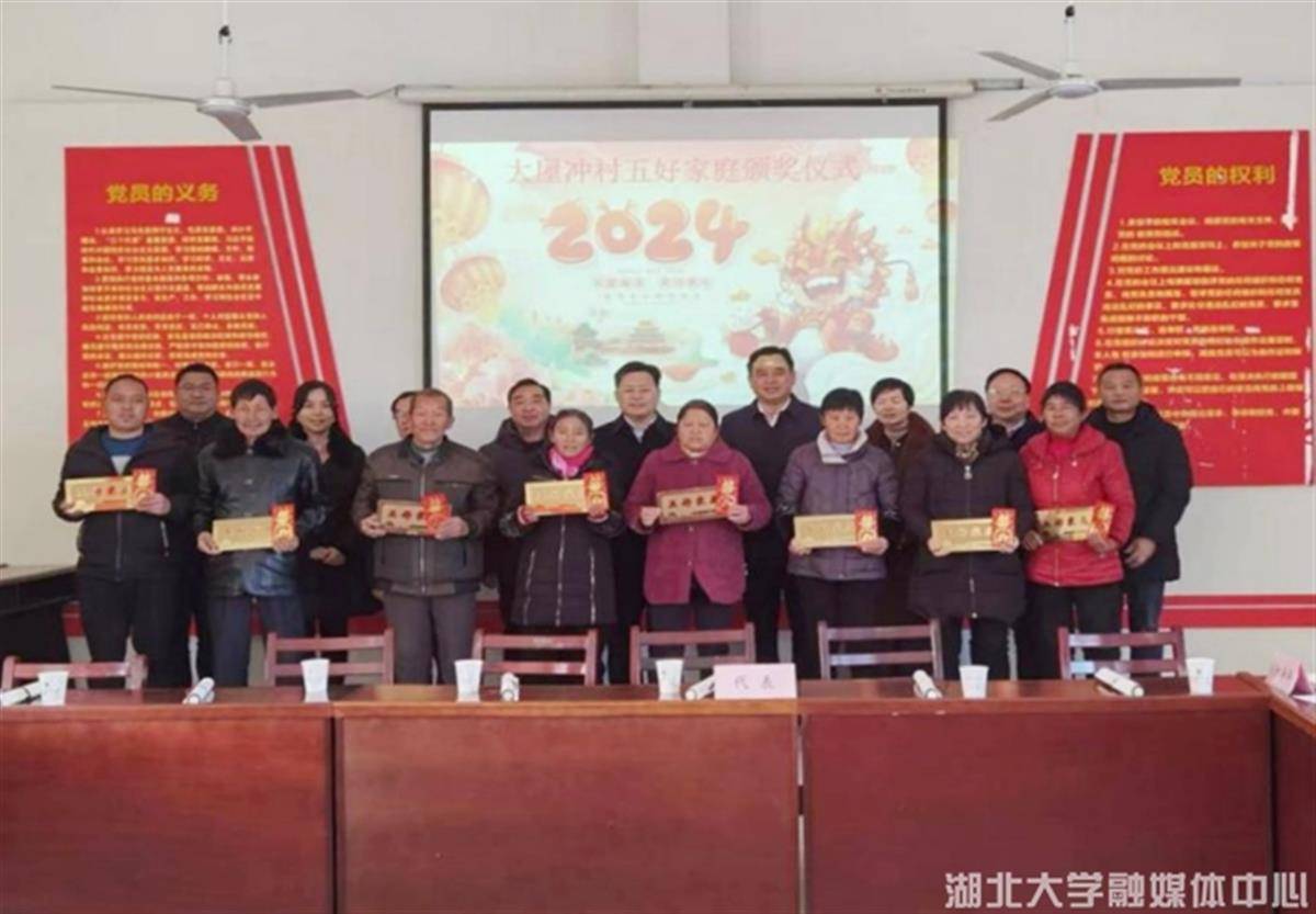 此次“五好家庭”颁奖活动是在学校机关党委和石头咀镇党委、大屋冲村支委共建“大屋冲村新时代文明实践站”的基础上,加强大屋冲村精神文明建设、注重家庭家教家风建设的有力举措,系该村首届“五好家庭”评选表彰。前期,在学校机关党委指导下,经村民小组、村两委和驻村工作队共同努力,在全村范围遴选出8个“五好家庭”代表。这些家庭中既有崇尚文明、勤俭节约之家,也有弘扬美德、互敬互爱之家,既有重视教育、以德育人之家,又有家庭美满、邻里团结之家,既有乐于助人、甘于奉献的友善之家,也有相濡以沫、患难与共的坚强之家,彰显了无数平凡而可敬的家庭日常生活的真实缩影,极具代表意义,对激励广大村民爱国守法、勤劳致富、移风易俗、尊老爱幼、邻里和睦起到很好的典型示范作用。