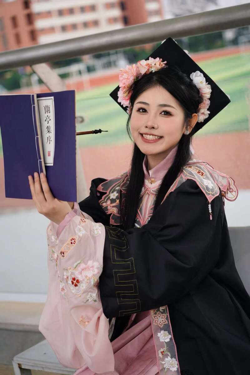 6月8日,昆明传媒学院2024届毕业生王倩同学,将国风簪花和马面裙融入学士服中,“新中式搭配”让毕业季创意满满。昆明传媒学院 冯柳敏/摄