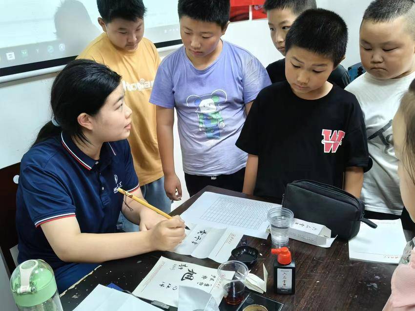 一支毛笔,一张白纸,经过孩子们的一双巧手,一番书写,书法字体赫然出现在孩子们面前。团队成员汪晨晨带领孩子们使用不同字体写下了自己的名字和《七子之歌》中的城市名,孩子们在书法练习中,逐渐明白了汉字的演变及独特魅力。